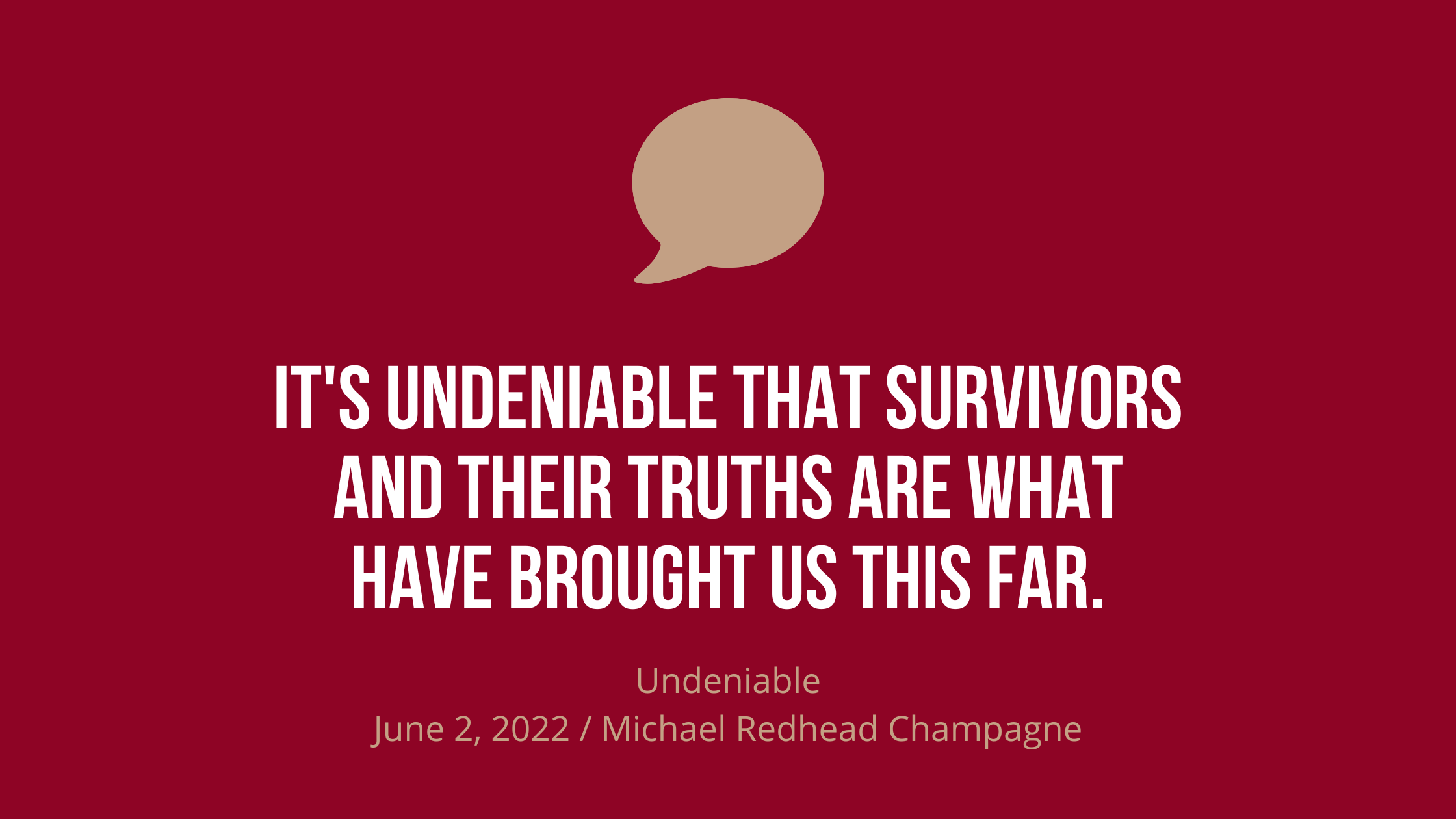 It's undeniable that survivors and their truths are what have brought us this far. It is the undeniable pain and loss in their stories that they have overcome in the face of so much that shows us all that we can persevere. It is undeniable that within Indigenous knowledge are the teachings we need to bounce back from tough moments like this. We have teachings on grief and loss, on truth, on justice and we need those teachings especially when we struggle. It's undeniable that we need our allies to help advocate, support and implement the wishes of survivors and their families. It is undeniable that I will do what I can to learn these teachings, heal myself and my family, walk in a good way and push these systems so that we can care for all of our relatives, especially survivors and their families.