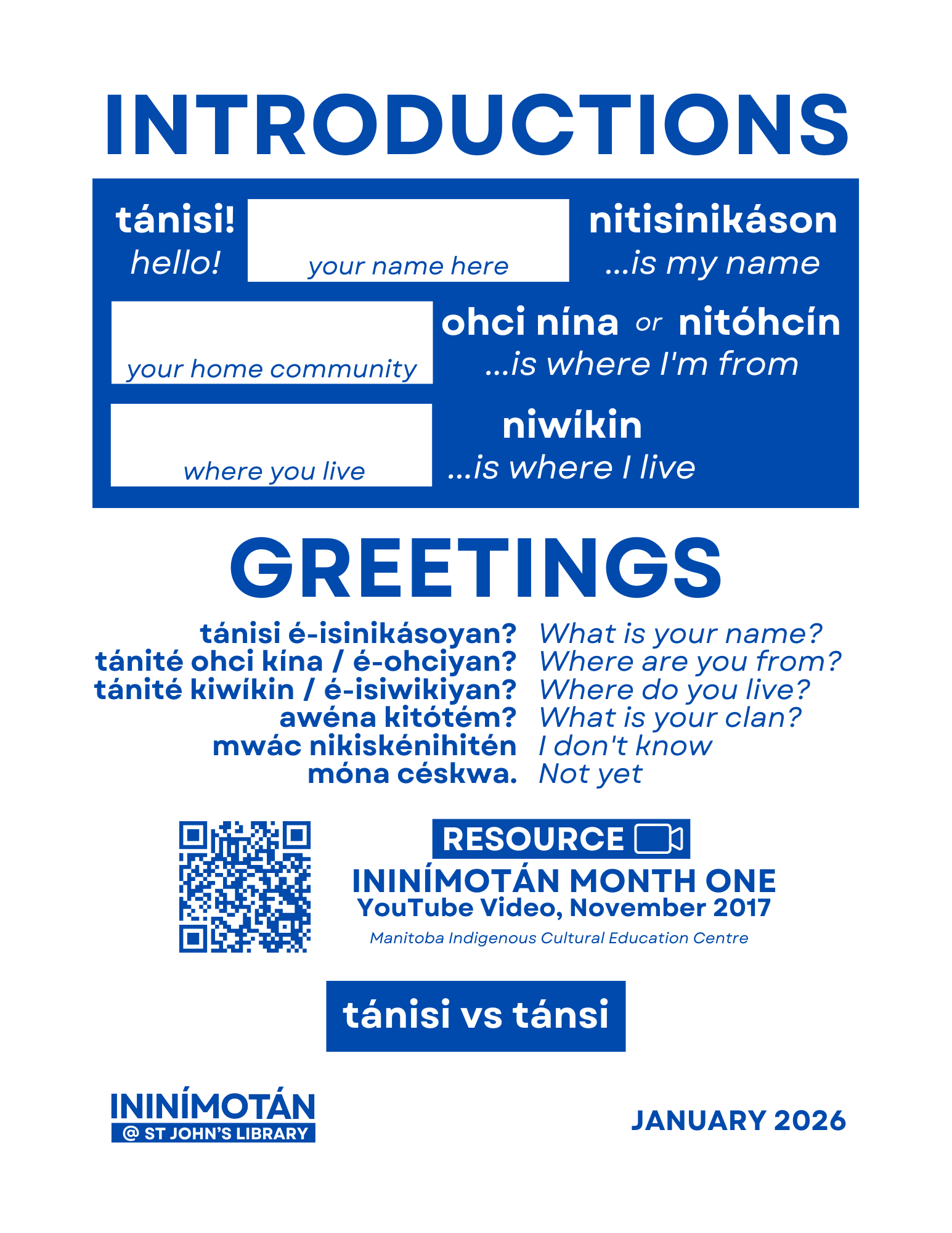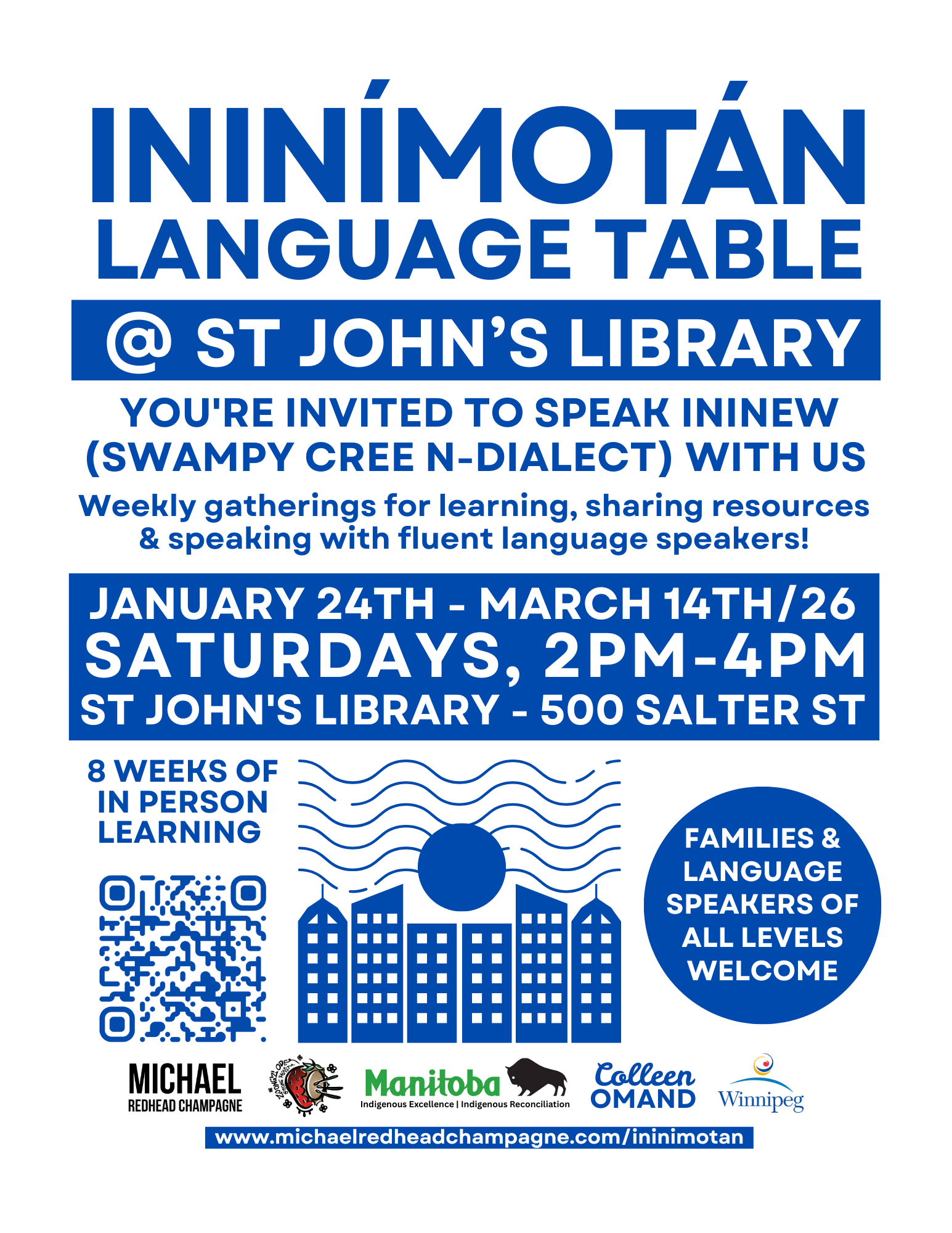 Thank you to the St John’s Public Library (City of Winnipeg) for sharing their beautiful space for this initiative. Additional partners include Zoongizi Ode Inc, Government of Manitoba Indigenous Reconciliation Secretariat, Government of Manitoba Indigenous Excellence & Colleen Omand our language teacher. Special gratitude to those who created the resource we are using and sharing “Ininímotán: Becoming A Successful Cree Eavesdropper”